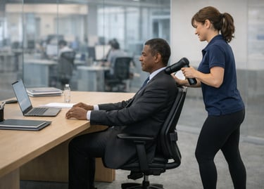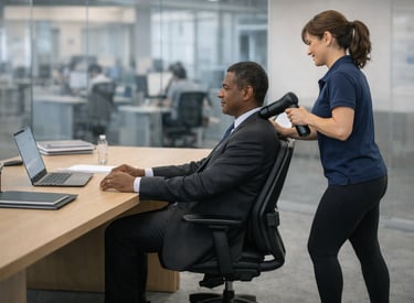 Atendimento rápido no próprio posto de trabalho, com foco em descompressão muscular sem impactar a rotina operacional.