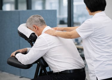 Sessões rápidas de massagem realizadas dentro da empresa, com foco em relaxamento e redução do estresse.